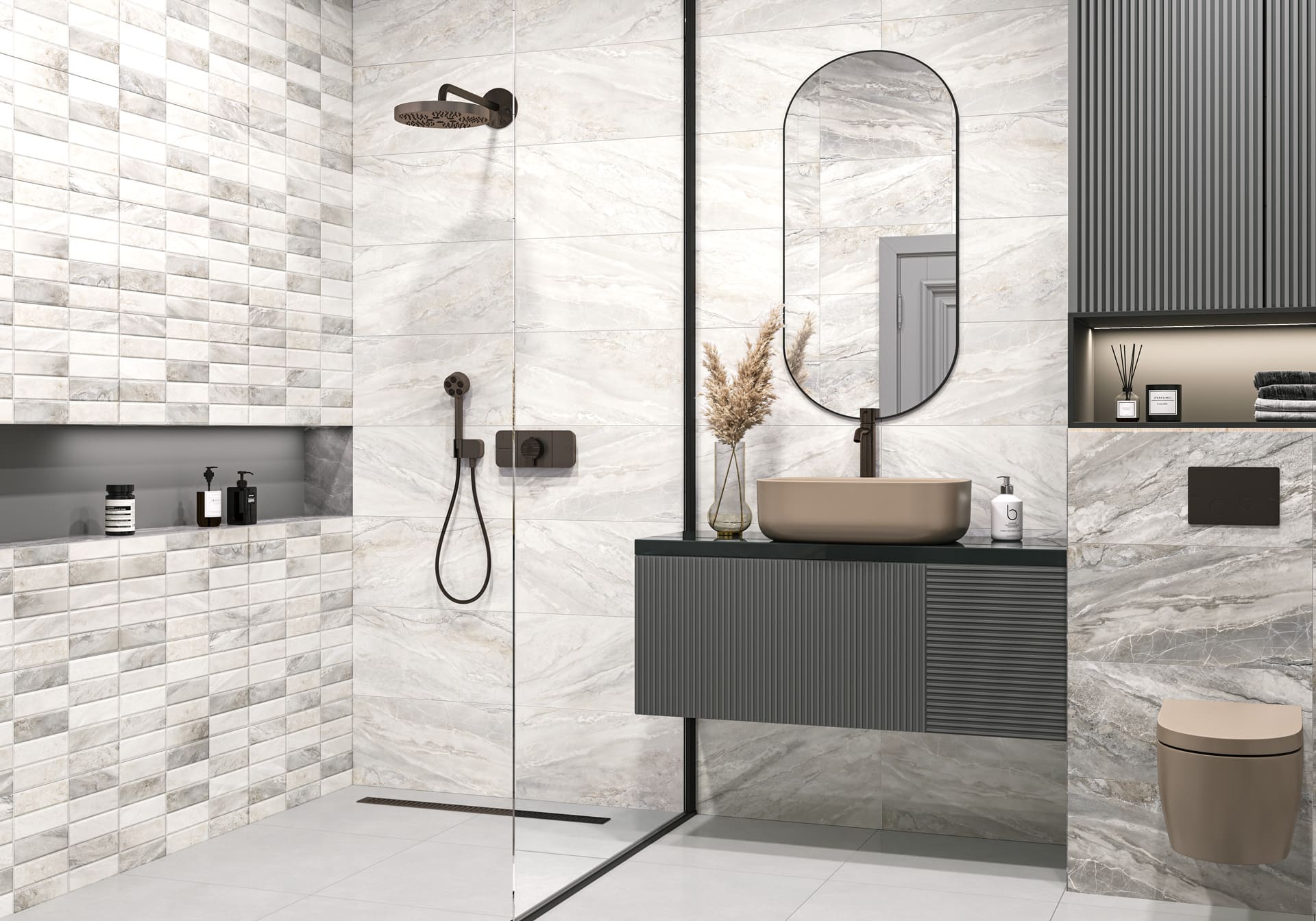 Словно море в интерьере. Две гаммы (тёплая и холодная) позволяют гибко работать с пространством. Изюминка коллекции — декор на рельефе «кирпичик» с сохранением мраморного рисунка. Создаёт потрясающий объём на акцентных стенах.